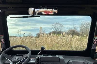 This is a great windshield for the CF Moto Uforce 600. The glass is laminated safety glass, the same as many automotive windshields. The powder coated metal frame is made from 14 gauge steel. The 16" hand operated wiper comes in handy on rainy days.