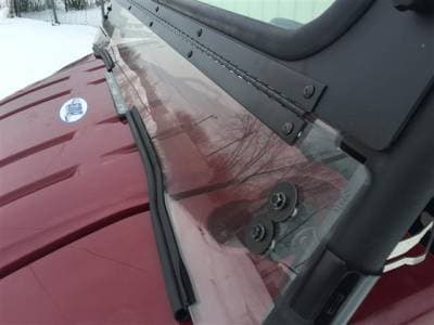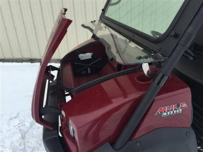Now, you can have an automotive style Laminated Glass Windshield on your MULE 4010. The top portion is laminated glass and the lower vent portion is Hard Coated Polycarbonate. The vent adjusts to three positions including fully closed. Once, installed it can be removed without any tools. Works with most tops including the EMP P/N 10499 shown.