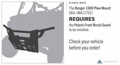 THE RANGER 1000 PLOW MOUNT PN 11752 REQUIRES THE POLARIS FRONT BRUSH GUARD TO BE INSTALLED, CHECK YOUR VEHICLE BEFORE YOU ORDER.
