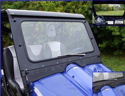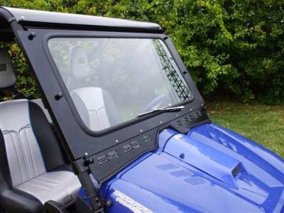 This windshield is made from laminated safety glass like most automotive windshields. It features a metal frame that can easily be removed with 6 thumbscrews. The hand operated wiper can be operated from the driver or passenger seat. The louvers along the bottom allow a little airflow to keep the windshield from fogging and eliminate the draft from behind, common with most full windshields.
