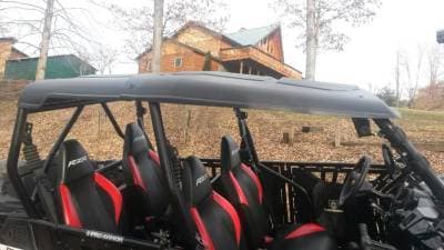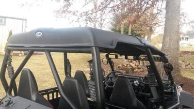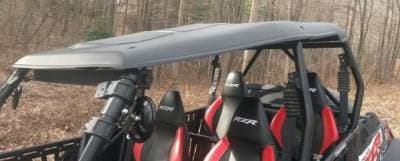 Add style and function to your RZR-4 with this “Cooter Brown” top. Unlike other tops on the market this top extends all the way to the sides protecting your shoulders from the rain etc. The top ships in two pieces and bolts together at assembly. Rubber coated mounting straps will not scratch your cage. Made from rugged 3/16” Thick Polyethylene (not ABS like other tops) making it very durable. Polyethylene is the same material used to make ATV fenders.