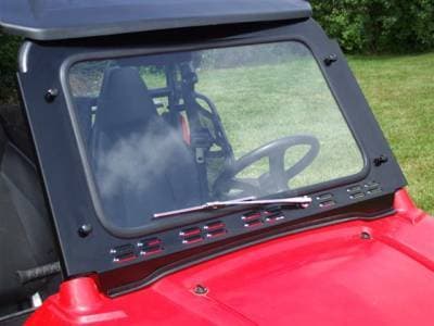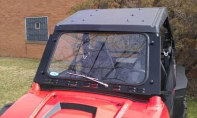 This is a great windshield for the RZR. The glass is laminated safety glass, the same as many automotive windshields. The powder coated metal frame is made from 14 gauge steel. The side edges are not only bent, they are hemmed over to make a smooth edge to the touch. The windshield wiper is hand operated from either the driver or passenger seat. It will fit with the factory top pictured and many other aftermarket tops. The louvers along the bottom let is just enough airflow to help prevent a vacuum while keeping the wind off of you. Also, as with most EMP windshields it comes with our "Quick Connect Windshield Clamps" so removing your windshield is as simple as removing six thumbscrews.