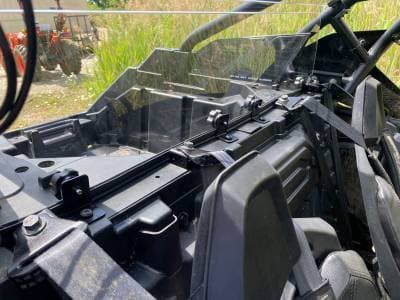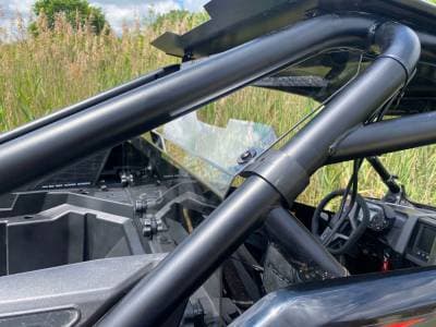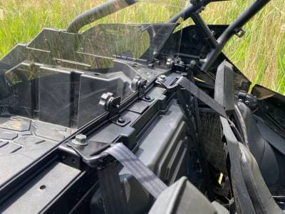 Made from 1/8" thick hard coated AR2 Polycarbonate. It features our "Fast Straps" so you can easily remove the windshield without any tools. Simply unhook the rubber straps and remove the thumbscrews. Rubber straps will not scratch your cage.