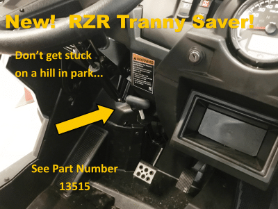 Protect your RZR from rolling back and getting stuck in part. So, often the RZR will roll back a little before you engage your RZR into park. Simply, step on your brake apply the lever and then put your RZR in park. When ready to drive again simply step on your foot pedal and release the Tranny Saver II then while still holding your foot on the brake engage your vehicle transmission into L, H or reverse.