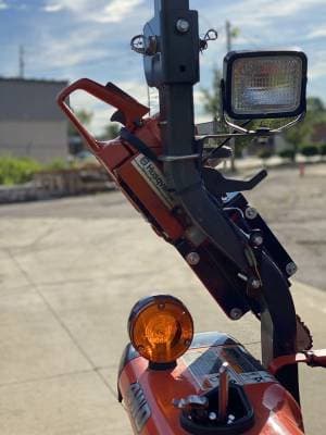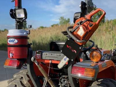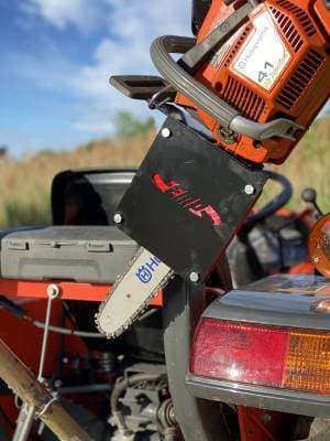 Now, you can easily store your chainsaw on your tractor while working in the yard or forest. Slide the blade into the rack and secure it by hooking a rubber bungee cord over the top.