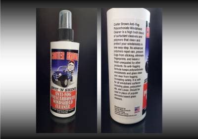 Cooter Brown Anti-Fog Polycarbonate Windshield Cleaner is a high tech blend of surfactant cleaners and protects your windshield in on easy step. Its advanced polymers repel rain, prevent bugs from sticking, eliminates finger prints, and leaves a finish unequal to other products. Its anti-fogging formula keeps polycarbonate windshields and clear increasing safety. It is safe for windshield surfaces including glass and polycarbonate (Lexan). Should be used in place of popular ammonia based cleaners that will cause damage to your polycarbonate windshield. Sold in four oz. bottles.