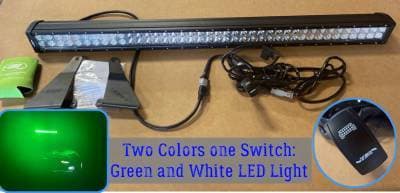If this is the kit you have been waiting for your wait is over. It includes everything you need to install a Quality DUAL Color, DUAL ROW, Combo Beam LED Light Bar to your RMAX. Click the switch once for a Green Light (Great for night riding and hunting) click it again for a Brite White Light. The switch matches the factory RMAX Rocker Switch cutouts in the dash and the it wires to the factory plug under the hood.